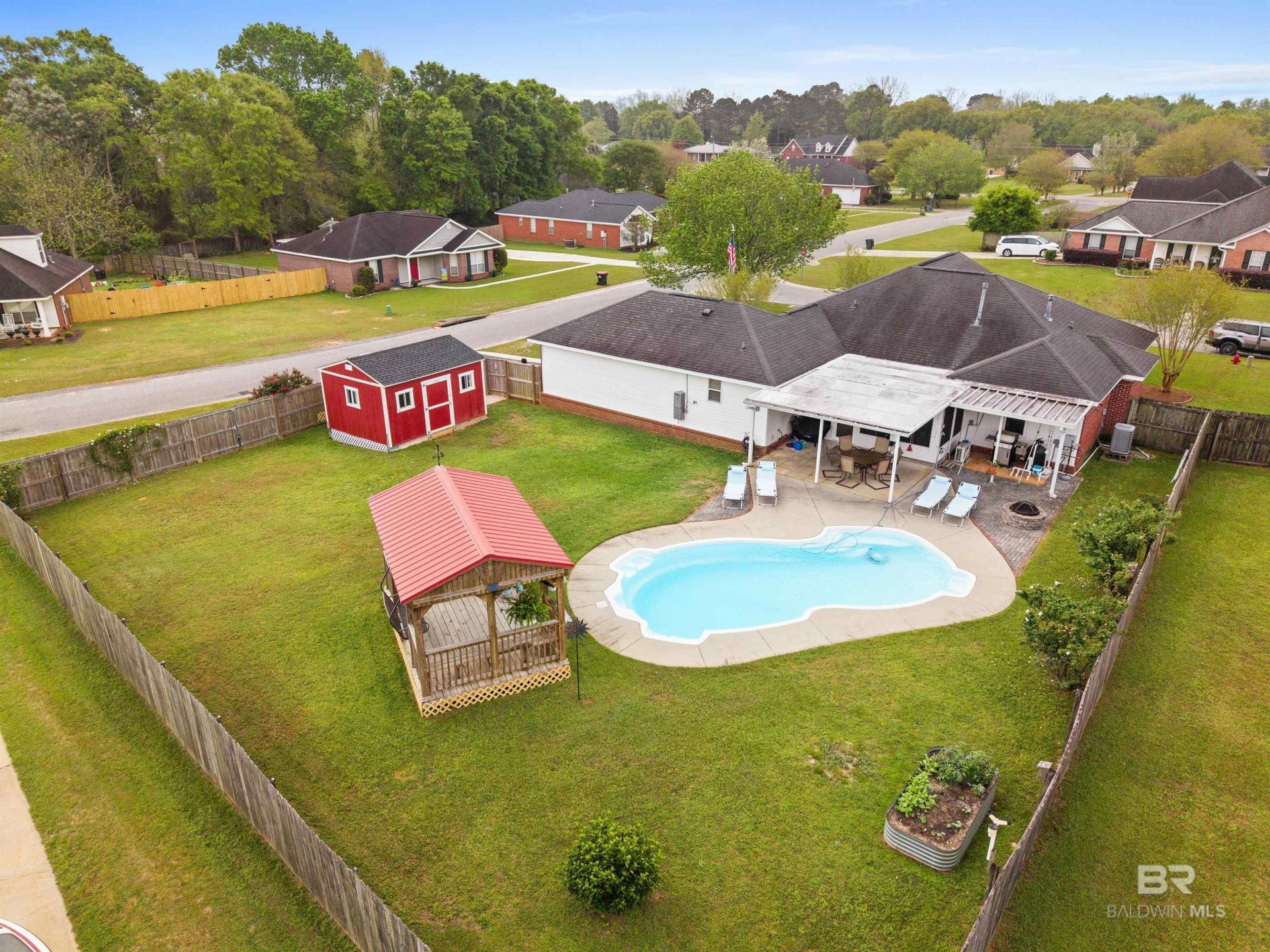 Located in Mobile's Scott Plantation neighborhood, this 3 bedroom 2 bathroom brick house sits on a fenced corner lot and has a pool, gazebo, shed and generator! All new windows 2021. HVAC with REME halo air filtration system (2025) and sun room mini split 2016. Tankless gas water heater 2017. Whole house generator 2023. Roof 2016. Inviting Foyer with an open floor plan. Eat-in Kitchen features white cabinets, granite counters, white subway tile backsplash, dishwasher (2024), gas range (2023), refrigerator, microwave, pantry. Breakfast room in kitchen. Living Room has a corner gas fireplace. Light drenched sunroom overlooking pool and beautiful patio. Sunroom could serve as a playroom, bonus room or office. Spacious laundry room. Primary bedroom has a large walk-in closet, double sinks, shower, garden tub. Split bedroom plan. 2 large guest bedrooms share a hall bathroom with 2 sinks. Sump pump on side of house. Backyard is an entertainer's dream. Chlorine pool is an in-ground fiberglass with 5 1/2' depth. Covered gazebo adjacent to pool. Covered back patio as well as fire pit. Large shed for extra storage. HOA is $125/year. Double garage with side entrance. Buyer to verify all information during due diligence.