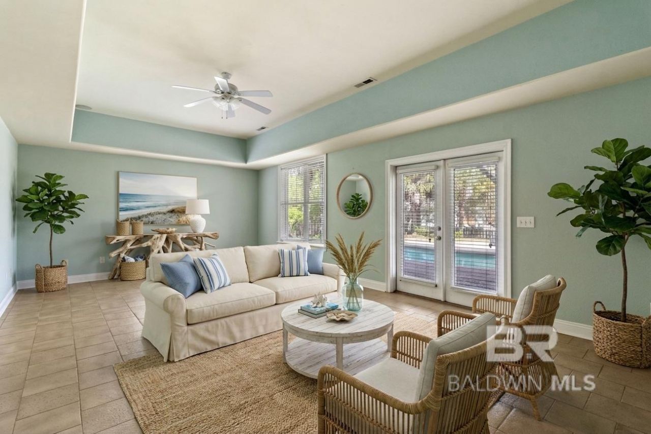 Rare find on the island gated community of Ono Island! Beautiful views of BOTH Gulf waters and Bayou St John Bay waters! Very convenient location near entrance bridge; on and off the island in 2 minutes!! You can walk or ride a bike to the beach! If the location is not enough, the large, spacious rooms are a staple for this house. On the main floor you will find a large foyer area with grand staircase, en-suite bedroom, half-bath/powder room, and kitchen, dining, laundry & living rooms. Upstairs from the main level is the 3rd floor, with spacious grand primary bedroom en-suite with beautiful views of the Gulf. Also, another bedroom with views north of bay waters. The lower level (downstairs) offers a bedroom ensuite as well as an adjoining Entertainment area. Each bedroom in this magnificent home has doors leading to one of the four decks giving this home a tropical flair. And prepare to relax by the in-ground pool and fenced back yard featuring a large area for gardening or planting. Well-water supplies the landscaping front and back. Large driveway offers room for boat storage on the side as well guests' vehicles. Ono Island has a number of owner amenities including a Rec Center with fitness room, indoor pool, tennis courts, a private boat launch, huge outdoor pool area and sports courts for other activities, greenspace for active owners. Schedule your showing today and get started living the Island Life! Buyers to verify all items of importance including square footage, room dimensions, and Community dues. All offers need to be on Baldwin County Assoc of Realtors Purchase Agreement. Buyer to verify all information during due diligence.